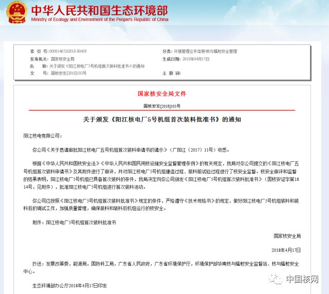 2018年4月17日,国家核安全局颁发《阳江核电厂5号机组首次装料批准书》(国核安发[2018]103号),批准阳江核电厂5号机组首次装料活动。 阳江核电站5号机组于2013年9月18日正式开工建设,采用中国先进百万千瓦级压水堆核电技术“ACPR1000+”。 目前,阳江核电站1、2、3、4号机组分别于2014年3月25日、2015年6月5日、2016年1月1日、2017年3月15日正式具备商运条件,6号机组正处于设备安装阶段。 |